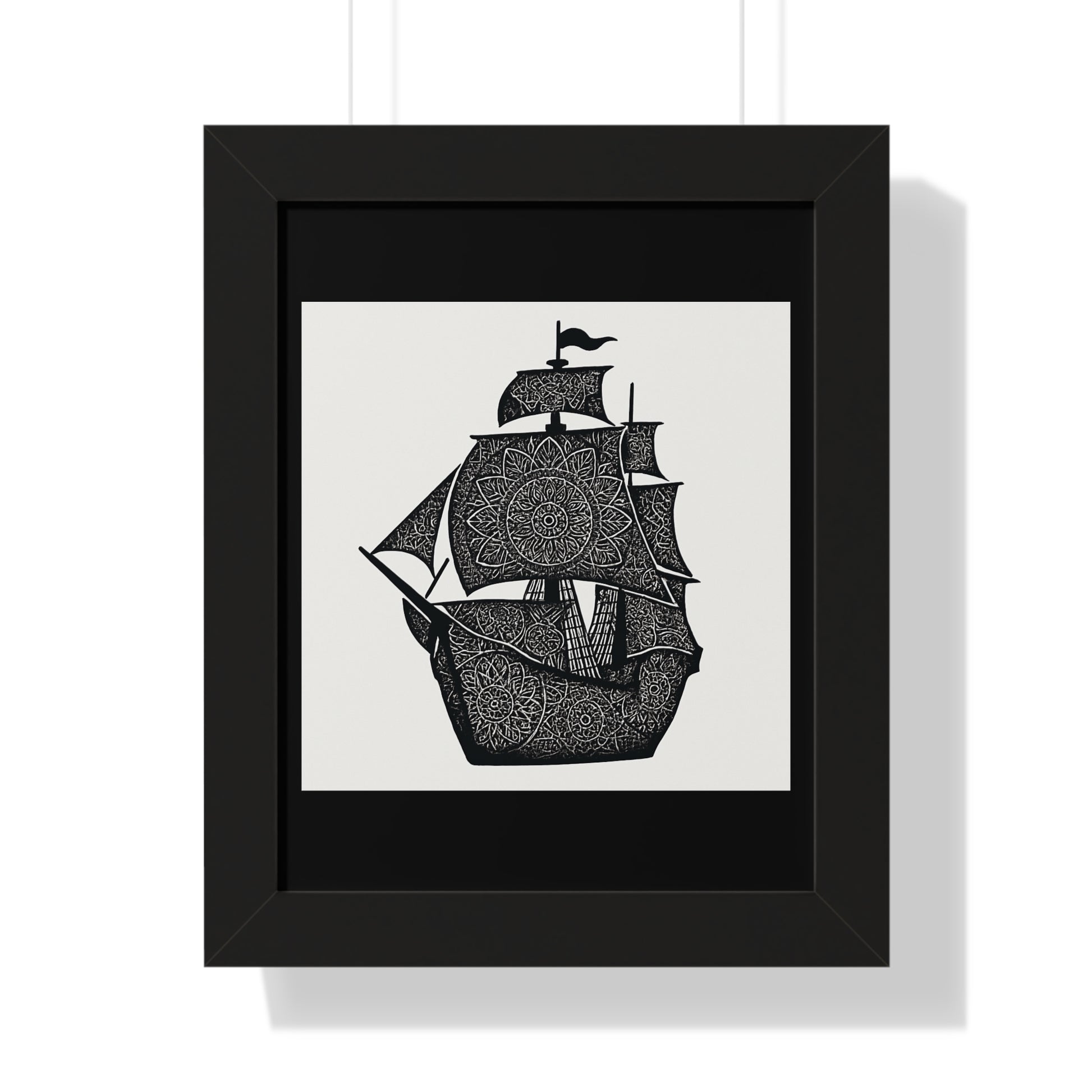 Black & White Mandala Ship Framed Vertical Poster — Nautical Zen Wall Art